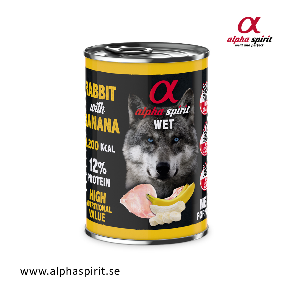 Alpha Spirit kanin/banan, ett helfoder på burk för de mest kräsna hundarna tillverkat av 100% färska råvaror.