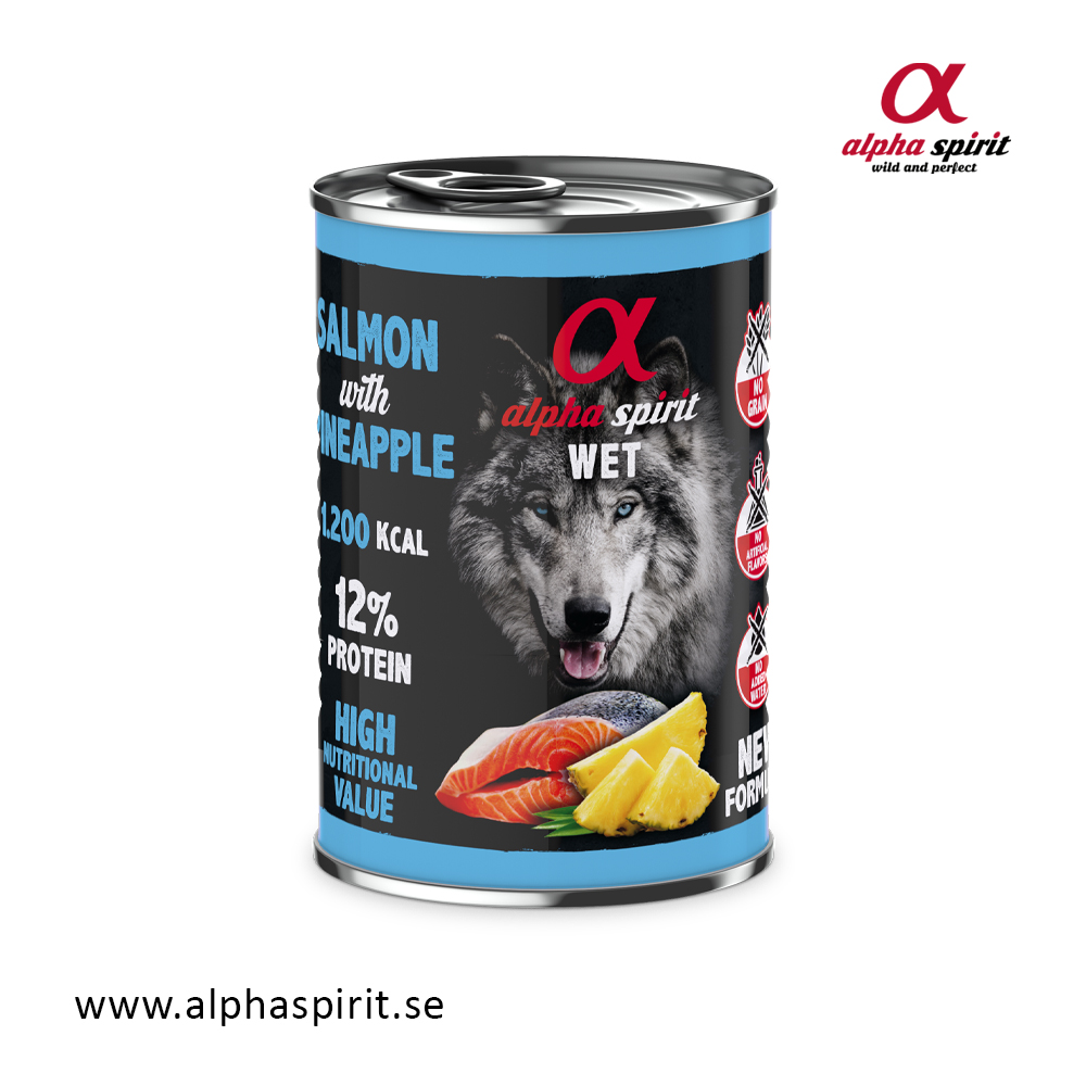 Alpha Spirit lax/ananas har kommit att bli en succé bland burkfoder, med smak av nyttig, vildfångad atlantlax och nyttig ananas. Ett helfoder för de mest kräsna hundarna, tillverkat av enbart goda, färska råvaror.
